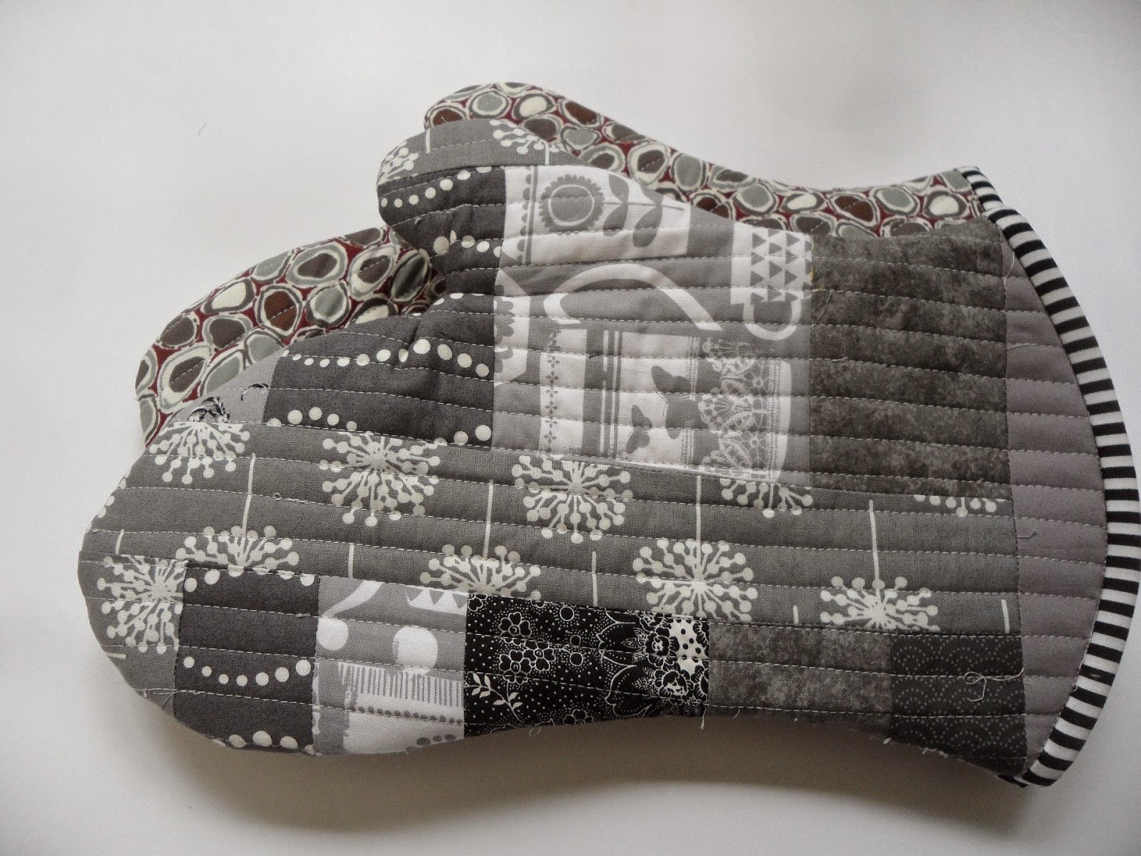 I made these oven mitts last weekend for Husband.  His oven mitts were looking a little sad and he asked me to mend them.  And I did that but noticed that the batting was starting to be thin and they were definitely worse for wear.  My grey scrap container was overflowing so I made some slab blocks big enough to cut out the oven mitts.  Added some batting and some insulbrite. Quilted it.  Binding and we were good to go.  They have been test driven and he has not burned himself with them so they have passed the test.    Officially, scrap project #3.